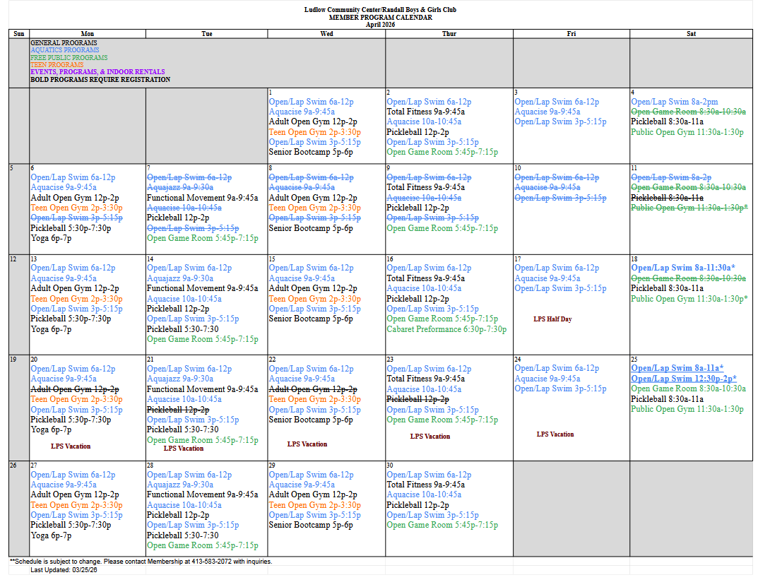 The pool will be closed starting today, Monday, April 6 and will be closed for the remainder of the week. The pool is set to tentatively reopen on Monday, April 13. Additional information will be emailed if the opening time changes. Thank you for your patience.